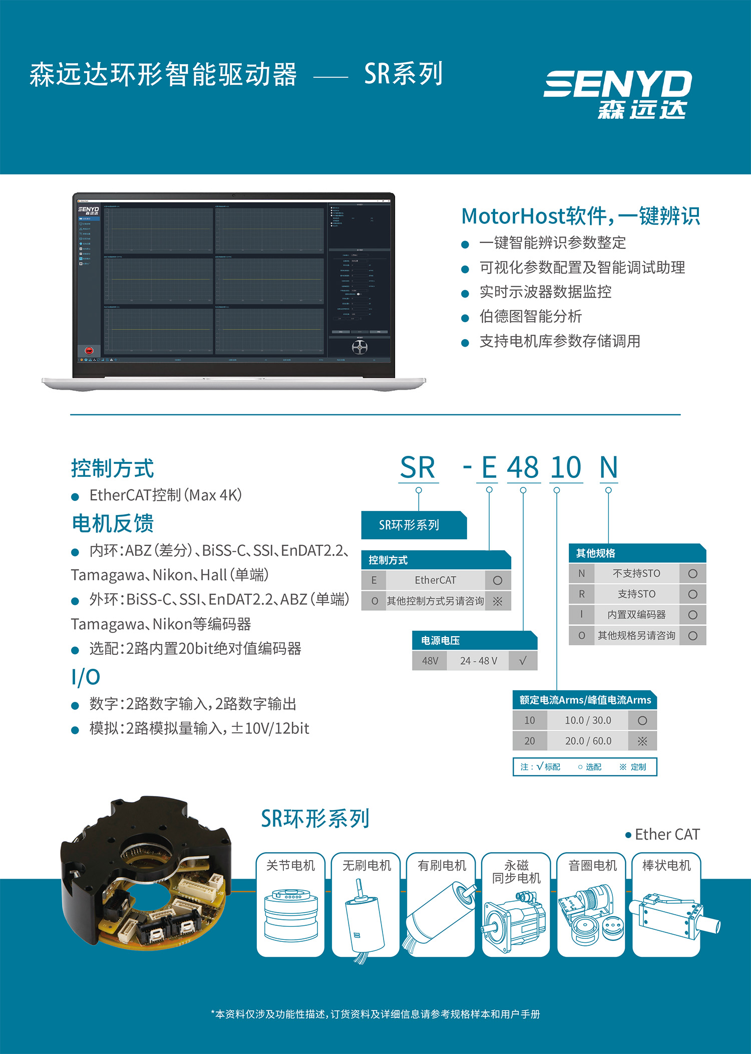 森远达SR环形驱动器电流环频率高达40KHZ,EtherCAT刷新频率可达到4KHz,响应更快,保证设备精度及性能表现。针对协作机器人、四足机器狗、一体化关节、外骨骼机器人、手术机器人等设备的紧凑型关节模组定制设计。